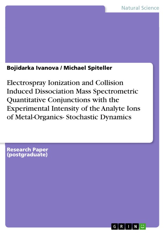 Research Paper (postgraduate) from the year 2019 in the subject Chemistry - Analytical Chemistry, University of Dortmund (Institute of Environmental Research, Department of Analytical Chemistry), language: English, abstract: Throughout the chapters in this book we argue that the temporal behaviour of the experimental mass spectrometric intensity of analyte ions obeys a certain and universal law based on a stochastic dynamic approach. The content of the book evidences convincingly through a selected series of examples to molecular systems of metal-organic complexes of transition metal ions with electronic configuration d10, for instance, AgI- and ZnII-ions, the validity of our model equation reported, more recently. It needs to be underlined that, the comprehensive study that is provided, herein, is published, for first time in the literature. The book, therefore, represents monograph containing results from our research work, detailing correlatively experimental and theoretical mass spectrometric analyses of metal-organics using ultrahigh accuracy electrospray ionization and collision induced dissociation mass spectrometry. An enormous amount of effort is concentrated on a quantitative description of the relationships between experimental measurable parameter "intensity" and diffusion or kinetic parameters of analyte ions.