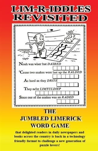 LIM-R-IDDLES – Fast, Effective and Fun! 157 brain teasing, laugh provoking scrambled word limericks to challenge readers of all ages If you enjoy puzzles, limerick poetry, words and delightful illustrations LIM-R-iDDLES is a book you must have. Millions of readers looked forward to working these scrambled word, limerick puzzles when it was a nationally syndicated newspaper feature that ran in hundreds of papers all over the country, then reprinted in two books by the Essanadess division of Simon and Schuster. Now it's been updated and available in a technology friendly form for eBook readers. It's also available as a CD, a computer download. What an enjoyable way to spend a few minutes tickling your own funny-bone with the bonus of building your vocabulary and knowledge of words- no matter your age! LIM-R-IDDLES offers a different sort of challenge than the usual crossword puzzles, scrabble, word searches, codewords, word fit, sequences or number puzzles. No matter what sort of puzzle fan you may be these are not only unique, but because of the eye-catching art in each one, you'll look forward to each new puzzle. They are fast and great fun to do, even when you have just a few spare minutes to devote to a bit of worthwhile recreation. For home-schoolers and those in public schools, too, it's the perfect way to entice kids of all ages to look forward to a break from the usual dreaded word, spelling and dictionary drills that are so important in building language skills. They'll laugh at the limericks, the puns and the enticing pictures that give a visual clue to the puzzle. LIM-R-IDDLES are no strangers to classroom situations because they were used by many teachers as part of the popular Newspapers in the Classroom offered and promoted in many cities by local newspapers as an adjunct to the usual curricula. For seniors with AZ or dementia symptoms, in group situations or individually, the puzzles provide recreation and stimulation - the kind of “brain exercise” specialists in these disciplines recommend. The original syndicated newspaper feature was conceived by award winning writer, cartoonist and podcaster Dick Harrison and co-authored by the late Albert Adler. You'll fall in love with LIM-R-iDDLES because it will delight the entire family. Here's a sample, but without the delightful illustration you'll see in the Noah was wiser but DASRED 'Cause two snakes were last up the RALDED As hard as they DRITE They ne'er LIMTULDIEP Since one of the snakes was an RADED