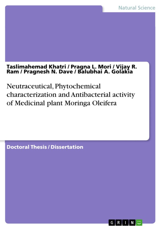 Doctoral Thesis / Dissertation from the year 2012 in the subject Chemistry - Analytical Chemistry, grade: 3, Kachchh University (Department of Chemistry), course: MSc, language: English, abstract: Moringa oleifera, an important medicinal plant is one of the most widely cultivated species of the family Moringaceae. It is highly valued from time immemorial because of its vast medicinal properties. The present study provides all necessary information regarding of four parts such as flower, leaves, seed and pulp of moringa like biochemical, phytochemical, mineral, antibacterial activity and its nutritional value. The benefits of essential nutrients and minerals for maintaining good health were also highlighted in this study. The results of proximate analysis of Moringa oleifera revealed that the protein (9.37%), carbohydrate (7.33%), ascorbic acid (2.10%) and total soluble sugar (0.73%) were highest in flower as compared to leaves, seed and pulp. While free amino acid (9.84%) was found to be higher in seed, total phenol (0.29%) was higher in leaves and reducing sugar (0.43%) higher in pulp of the moringa. The result of qualitative analysis of amino acid represented that lysine, glycine, threonine, valine, Isoleucine, tryptophan, alanine and cystein were present in moringa. The flower also contained higher amounts of crude fibre (0.23%) as well as moisture (90.56%), while fat (15.53%) content was found higher in seed. The dry matter (30.40%) and total ash (2.12%) content were higher in leaves. The ash content represented minerals in different amounts. The higher amount of potassium was found in flower (50.9%), seed (40.7%) and pulp (77.00%). Leaves contained higher amount of Calcium (57.18%). However Aluminum (10.00%) and Magnesium (6.07%) were found only in leaves. The result of heavy metal (zinc, lead and cadmium) and analysis represented that flower, leaves, seed and pulp have zinc (Zn), lead (Pb) and cadmium (Cd) found in lower amount then permissible limit for human body. The results of phytochemical analysis showed that terpenoids and steroids were present in all parts of moringa. Alkaloids present only in seed. Flavonoid was present in flower and seed, saponins was present in leaves, and tannin was present in leaves and seed. The result of antibacterial activity of different types of sample (flower, leaves. seed and pulp) of moringa showed that salmonella typhii was effectively inhibited to all the extracts studied. But Escherichia coli were not inhibited by any extract. Methanolic extract of flower, leaves, seed and pulp were highly sensitive against the salmonella typhii bacteria