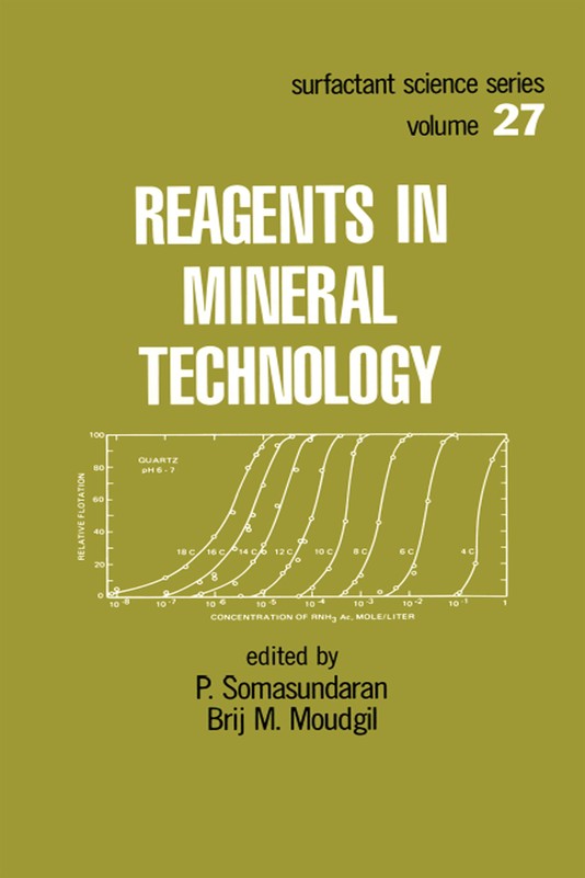 Reagents in Mineral Technology provides comprehensive coverage of both basic as well asapplied aspects of reagents utilized in the minerals industry.This outstanding, single-source reference opens with an explicit account of flotation fundamentals,including coverage of wetting phenomena, mineral/water interfacial phenomena, flo tationchemistry, and flocculation and dispersion of mineral suspensions.It then discusses flotation of sulfide and nonsulfide minerals, with attention to formation ofclithiolates, formation of metal thiol compounds, application of fatty acids, sulfosuccinic acids,amines, and other collectors.Reagents in Mineral Technology also reviews adsorption of surfactants on minerals .. .details adsorption of polymers .. . and considers the chemistry and application of chelation agentsin minerals separations.Additional chapters consider grinding aids, frothers, inorganic and polymeric depressants,dewatering and filtering aids, analytical techniques, and much more.Unique in its depth of coverage, Reagents in Mineral Technology will prove an invaluablereference for mineral engineers and processors; analytical, surface, colloid, and physical chemists;petroleum, petrochemical, metallurgical, and mining engineers; and for use in advancedundergraduate- and graduate-level courses in these and related fields.