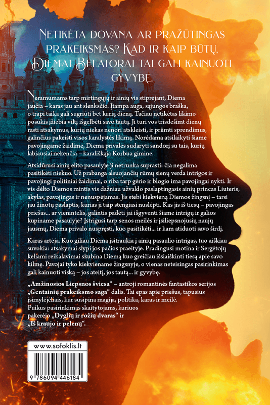 „Amžinosios Liepsnos šviesa“ – antroji romantinės fantastikos serijos „Gentainių prakeiksmo saga“ dalis. Tai epas apie priešus, tapusius įsimylėjėliais, kur susipina magija, politika, karas ir meilė. Puikus pasirinkimas skaitytojams, kuriuos pakerėjo „Dyglių ir rožių dvaras“ ir „Iš kraujo ir pelenų“.