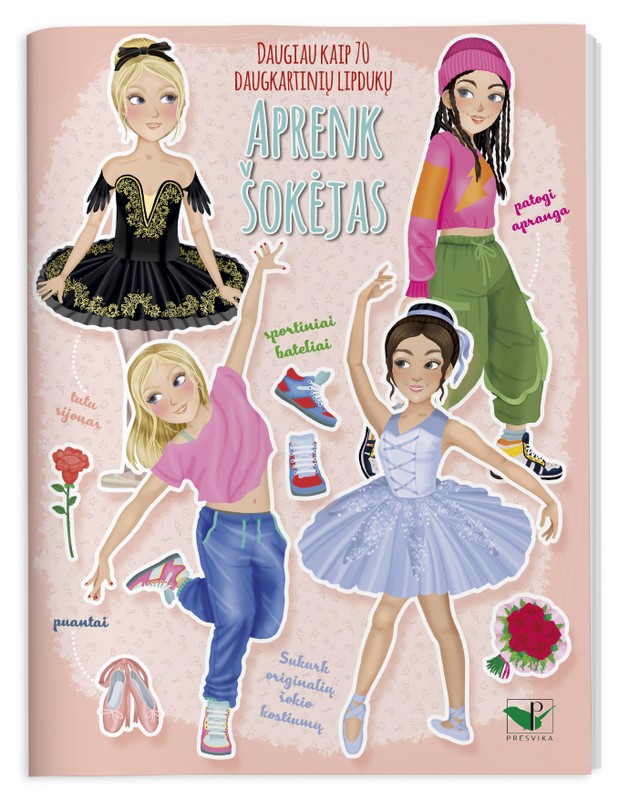 Įtempkite vaizduotę ir sukurkite originalių kostiumų baleto ir šiuolaikinio šokio šokėjoms. Tam tikslui knygoje rasite daugiau kaip 70 daugkartinių lipdukų! Kartu susipažinsite su šokio aprangos elementais, tokiais kaip puantai, glaustinukės (triko), tutu sijonai ir pan. Linkime kūrybinio įkvėpimo ir smagios veiklos!