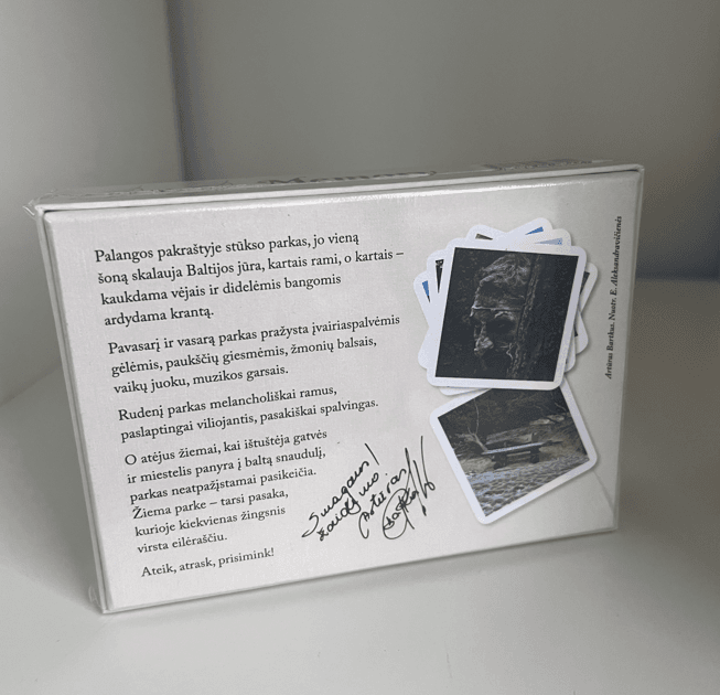 Žaidimas  „Memory“ Palangos Botanikos parko tematika. Kortelės su QR kodais, t.y. Palangos pajūrio video vaizdais iš paukščio skrydžio. Kortelių matmenys: 6 x 6 cm. Žaidimą sudaro: 60 žaidimo kortelių, 30 porų. Skirta 2–6 žaidėjams. Nuotraukų ir video failų autorius Artūras Bartkus. Išleidimo metai 2025. Dėžutės formatas: 14,5 x 10,5 x 3 cm. Taisyklės Žaidėjas, surinkęs daugiausiai porų, laimi! Sumaišykite visas žaidimo korteles ir sudėkite paveikslėliais į apačią. Žaidėjai vieno…