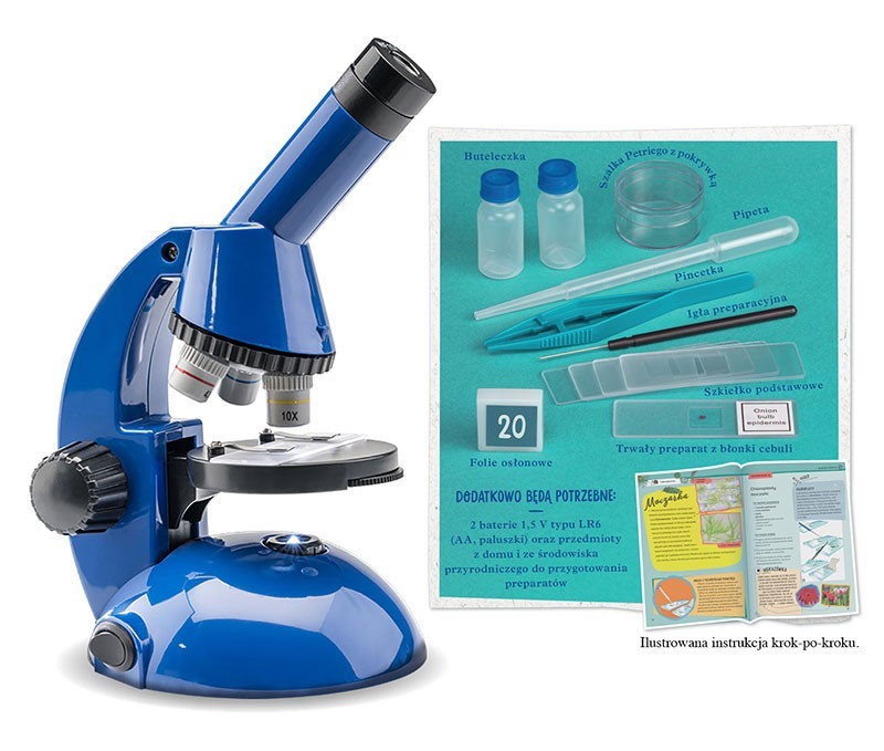 Mikroskopas turi 3 didinimus: x60, x150, x600. Rinkinyje yra naudojimo instrukcija lenkų kalba.