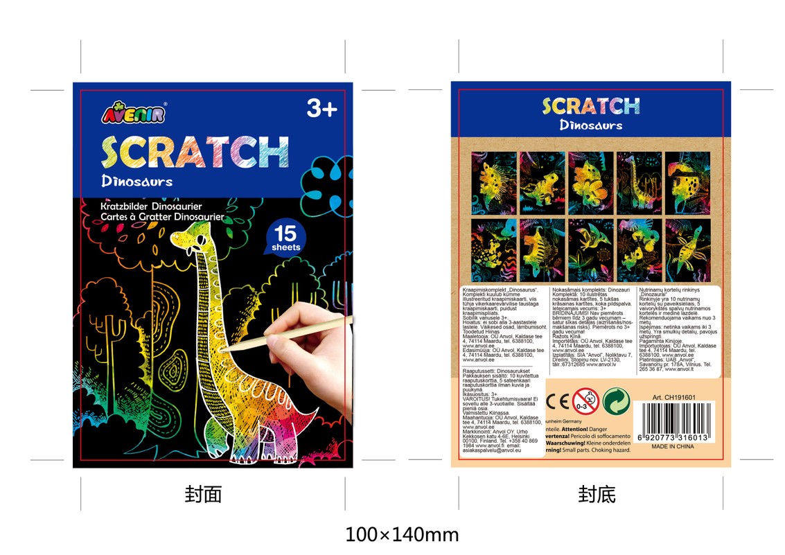 Šaunus ryškiaspalvis kūrybinis „Avenir“ rinkinys sudomins ir bus tikra pramoga mažiesiems menininkams. Šis rinkinys – puiki veikla kelionėje. 15 smagių nutrinamų kortelių su dinozaurų siluetais pasiruošusios tapti spalvingais meno kūriniais – tiesiog nutrink jas rinkinyje esančia lazdele ir atrask daugybę spalvų! Rinkinyje yra 10 nutrinamų kortelių su paveikslėliais, 5 vaivorykštės spalvų nutrinamos kortelės ir medinė lazdelė. Rekomenduojama vaikams nuo 3 metų.