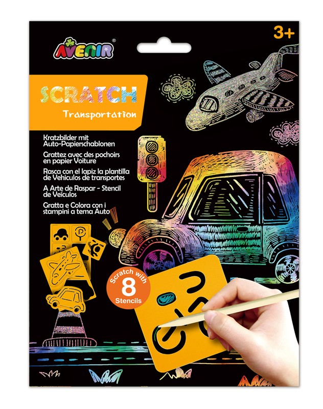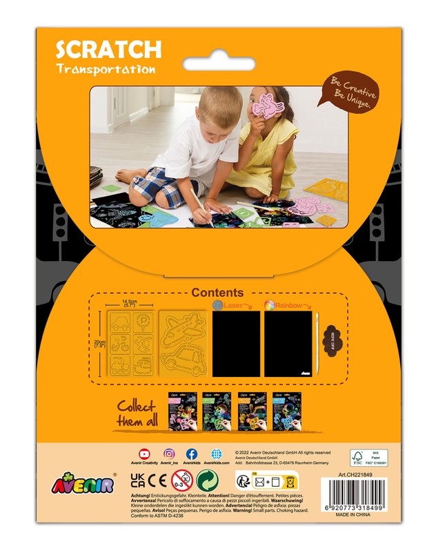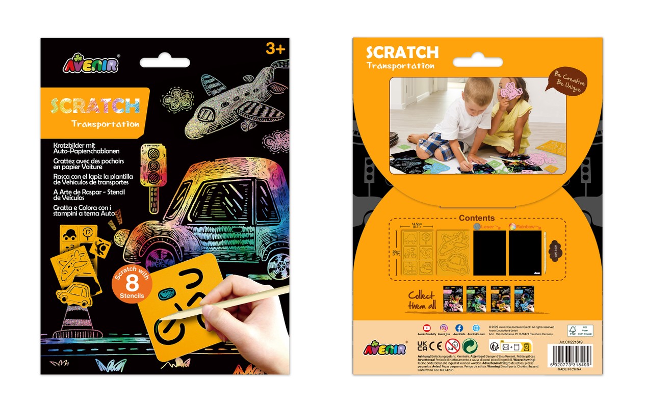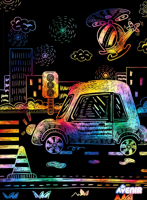 Šaunus ryškiaspalvis kūrybinis „Avenir“ rinkinys sudomins ir bus tikra pramoga mažiesiems menininkams. Nutrink juodą kortelių sluoksnį ir sukurk smagius eskizus. Rekomenduojama vaikams nuo 3 metų.