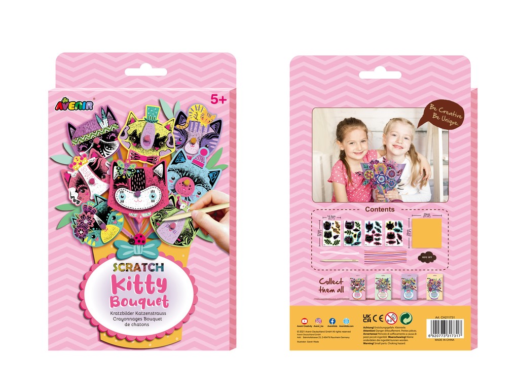 Šaunus ryškiaspalvis kūrybinis „Avenir“ rinkinys sudomins ir bus tikra pramoga mažiesiems menininkams. Šis rinkinys – tai ne tik nutrinami paveikslėliai, bet ir smagi kūrybinė veikla, nes nutrynus spalvotas, iš specialaus popieriaus pagamintas kačiukų detales, vėliau jas bus galima sudėti į rinkinyje esantį popierių ir sukurti gražią kačiukų puokštę!