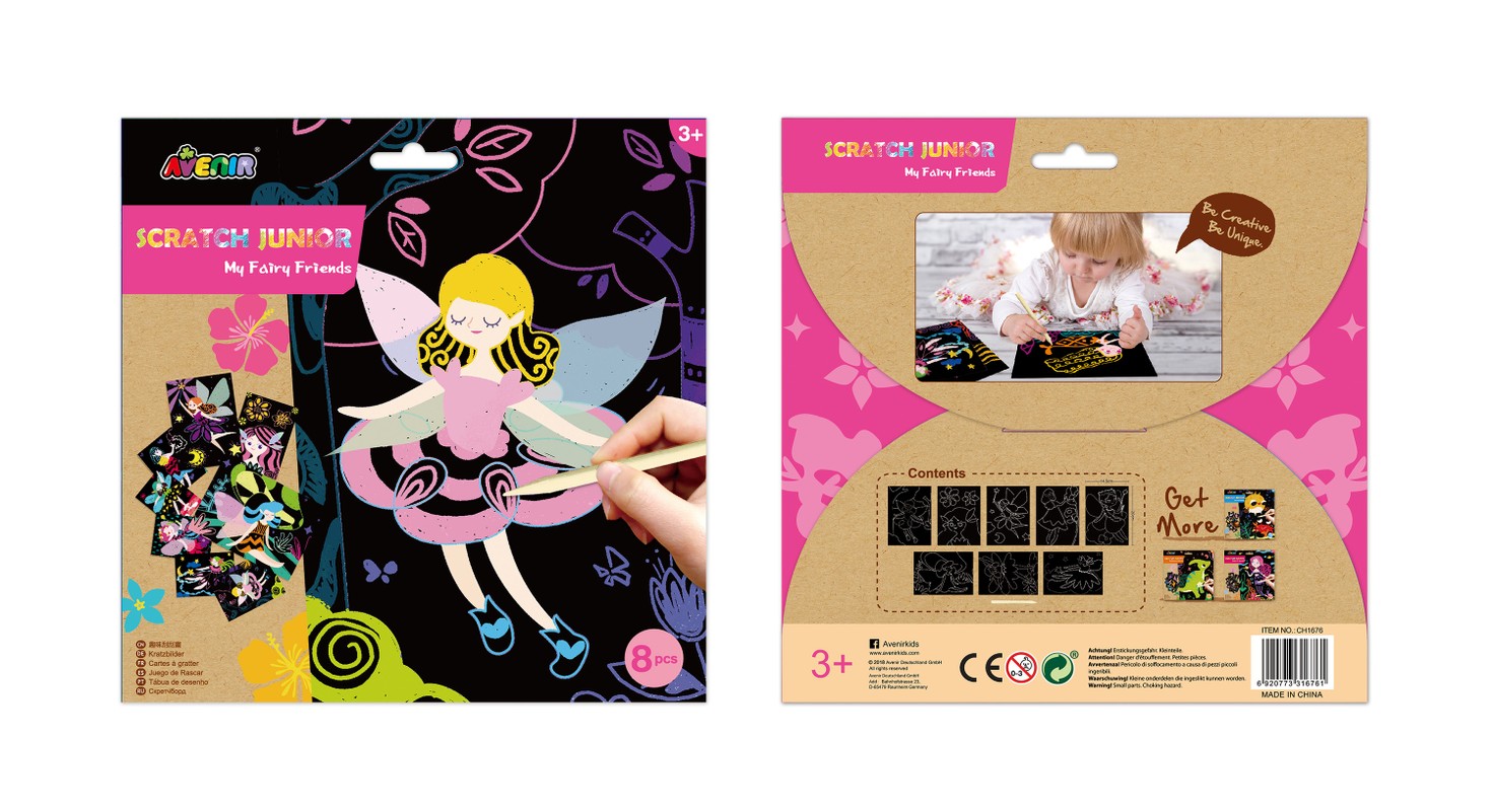 Šaunus ryškiaspalvis kūrybinis „Avenir“ rinkinys sudomins ir bus tikra pramoga mažiesiems menininkams. Nutrink juodą kortelių sluoksnį ir sukurk smagius fėjų paveikslėlius. Rinkinyje yra 8 nutrinamos kortelės ir speciali medinė lazdelė paveikslėliams nutrinti. Dydis – 23 x 0,5 x 23 cm. Svoris – 126 g. Rekomenduojama vaikams nuo 3 metų.