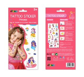 Priklijuojamos tatuiruotės „Princesės“. 1) Atplėškite tatuiruotę ir nulupkite apsauginę plėvelę. 2) Tatuiruotę paveikslėliu į apačią uždėkite ant odos. 3) Tatuiruotę 20 sekundžių drėkinkite skudurėliu. 4) Nulupkite popierinį sluoksnį ir 45 sekundes nelieskite, kad išdžiūtų.