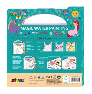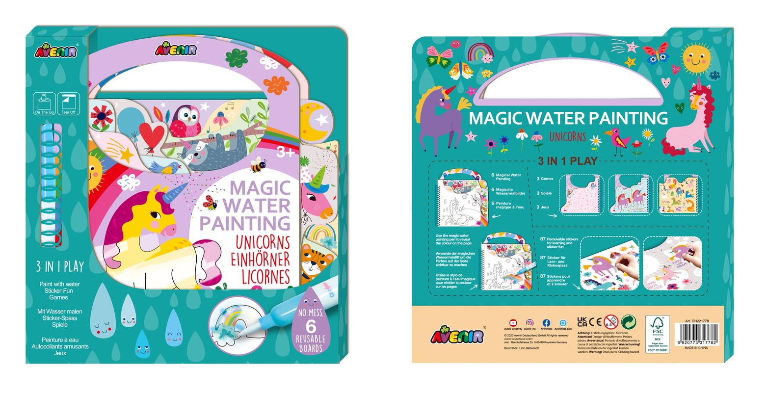 Magiškas tapybos vandeniu rinkinys – tai trys smagios veiklos vienoje patogioje knygelėje. Čia rasi 6 daugkartinio naudojimo spalvinimo vandeniu korteles, 2 lapus lipdukų ir ypatingą vandens rašiklį. Į rašiklį pripilk vandens ir brauk juo per knygelės lapus, taip atskleisdamas spalvotus paveikslėlius! Vandeniui išdžiūvus, paveikslėliai išnyks ir galėsi juos atskleisti vėl ir vėl! Kad būtų dar smagiau, knygelėje rasi ir daug kitų veiklų, skatinančių mokytis, lavinti vaizduotę ir atrasti naujų dalykų!