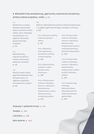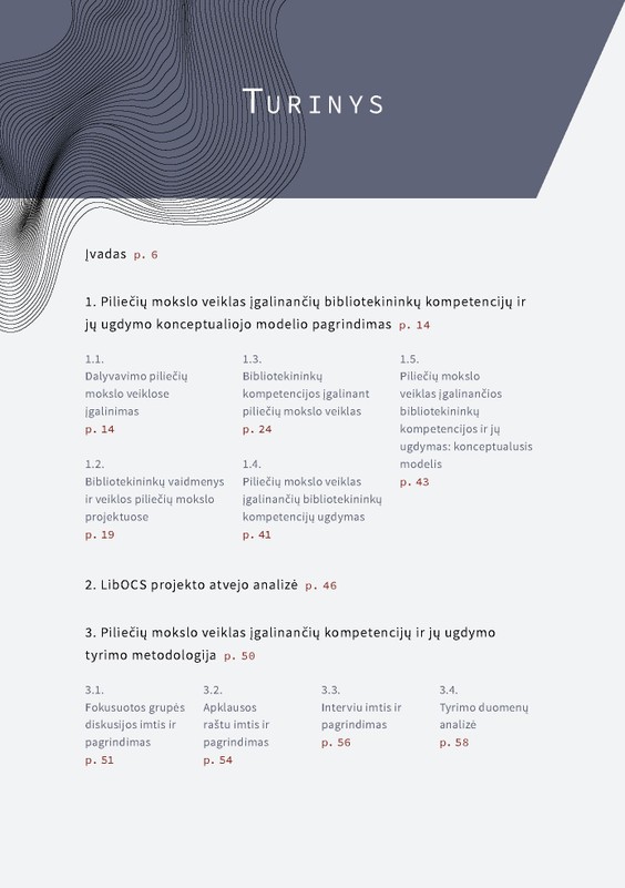 Teorinėje dalyje aptariamos bibliotekininkų kompetencijos, atsižvelgiant į institucinį ir kultūrinį kontekstą, pagrindžiamas piliečių mokslo veiklas įgalinančių bibliotekininkų kompetencijų ir jų ugdymo konceptualusis modelis. Empirinėje dalyje, remiantis LibOCS projekto, vykdyto Estijoje, Latvijoje ir Lietuvoje, rezultatais, analizuojamos Baltijos šalių bibliotekų patirtys piliečių moksle, pristatomos reikalingos žinios ir gebėjimai, kompetencijų ugdymo iššūkiai bei galimybės. Remiantis tyrimu, patikslintas kompetencijų ugdymo modelis, atskleidžiantis, kaip bibliotekininkai gali tapti tiltu tarp mokslo ir visuomenės – skatindami dalyvavimą, plėtodami atvirąjį mokslą, kurdami infrastruktūrą ir stiprindami mokslinį raštingumą.