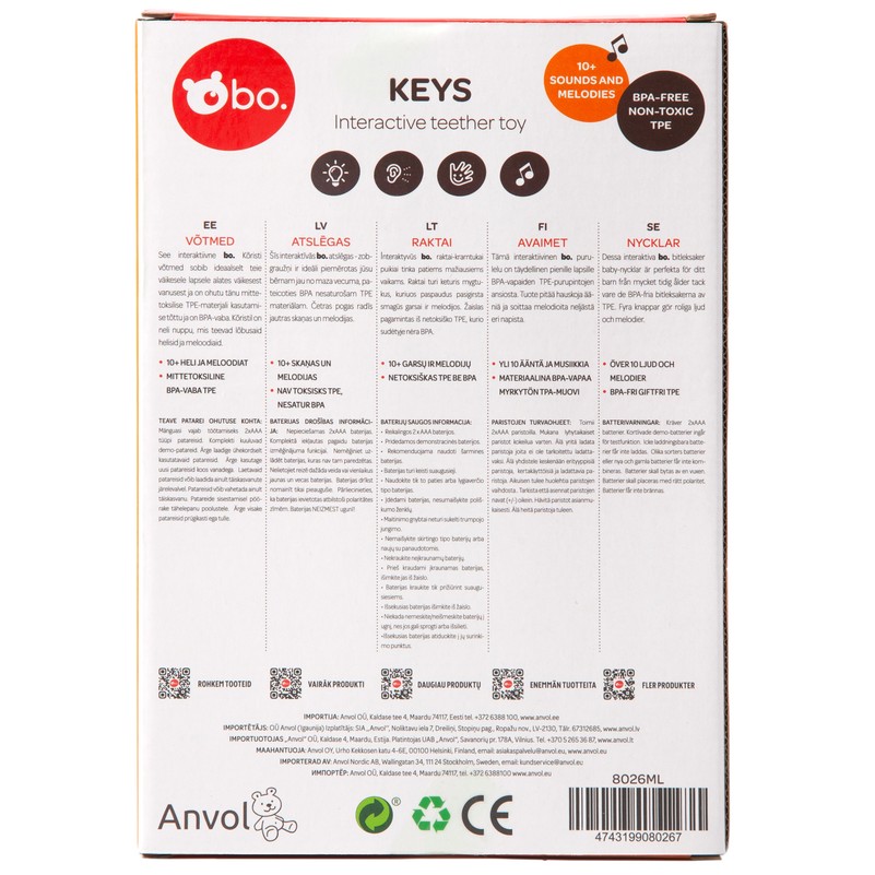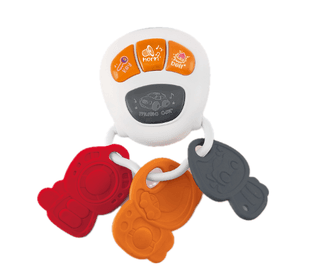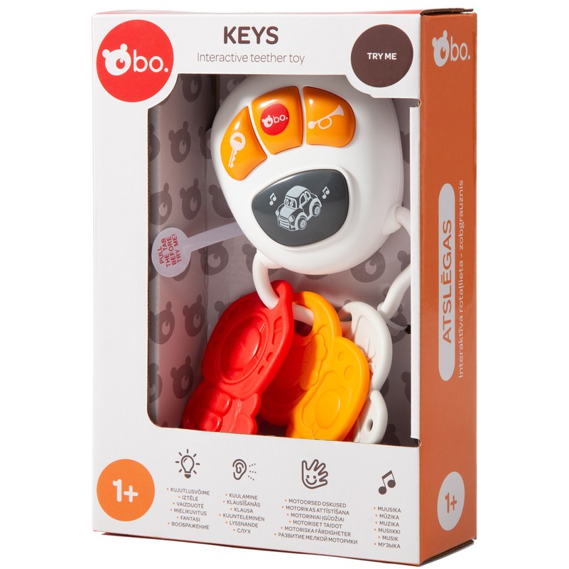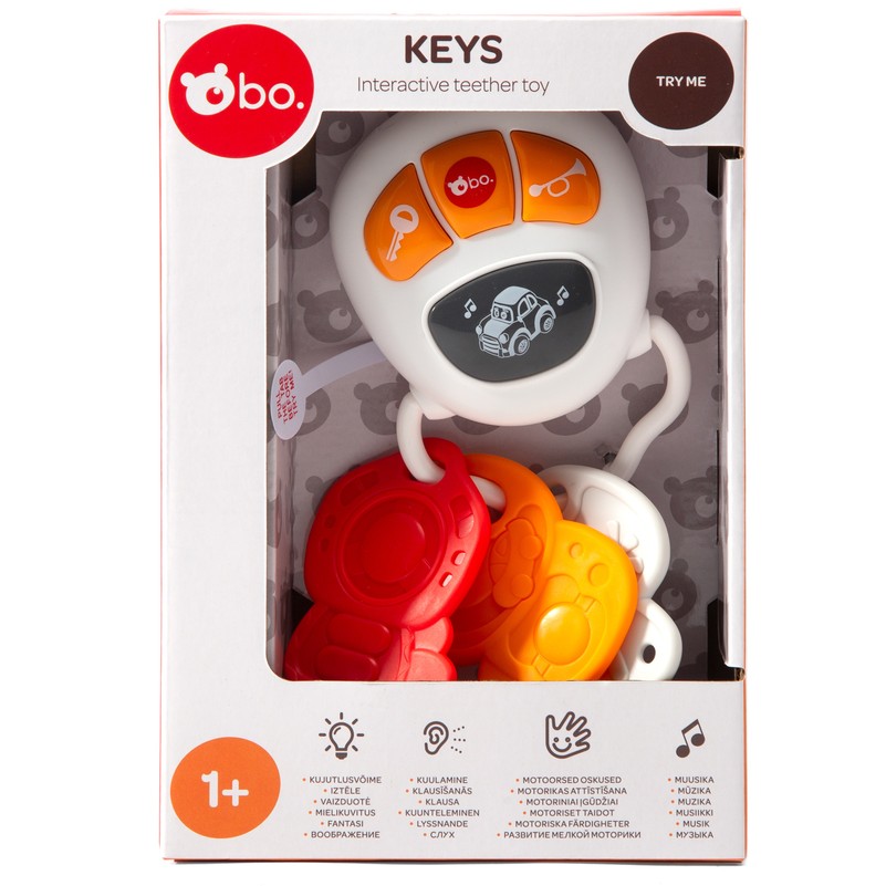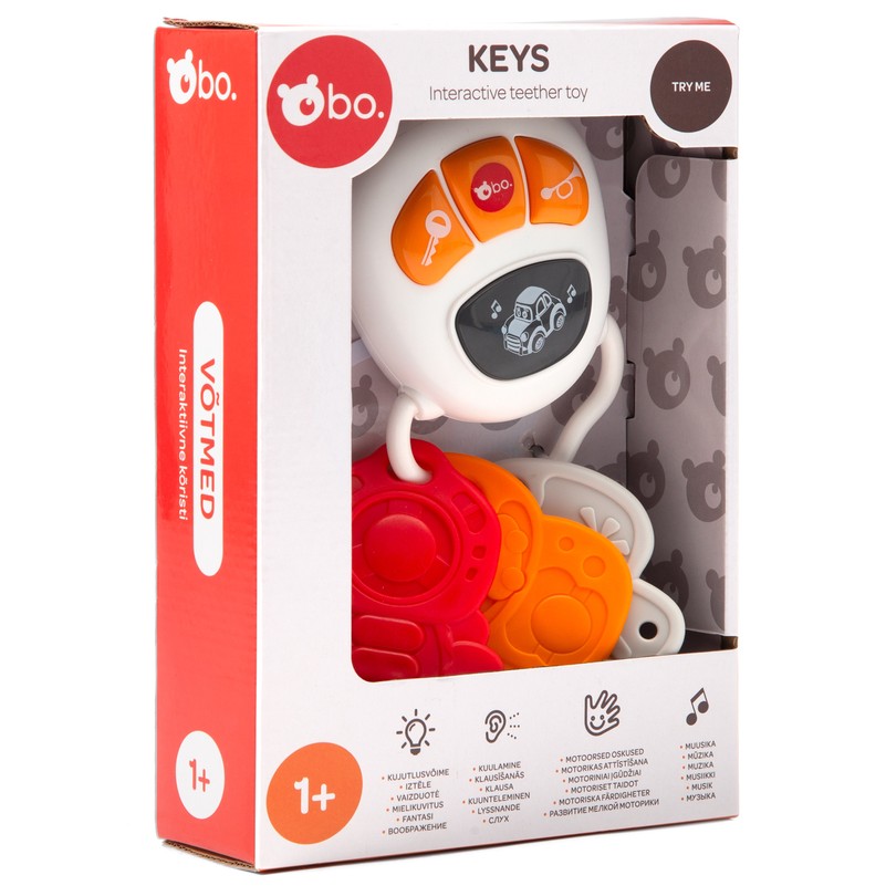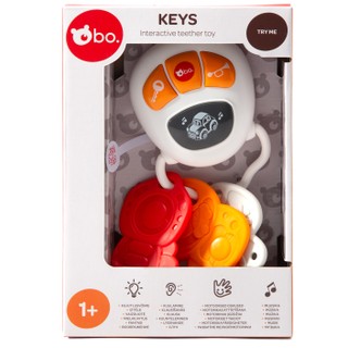 Interaktyvūs bo. raktai-kramtukai puikiai tinka patiems mažiausiems vaikams. Raktai turi keturis mygtukus, kuriuos paspaudus pasigirsta smagūs garsai ir melodijos. Žaislas pagamintas iš netoksiško TPE, kurio sudėtyje nėra BPA.
