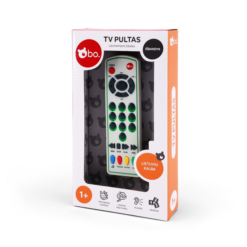 Nuotolinio valdymo pultas atrodo visai kaip tikras ir turi tiek daug lavinančių funkcijų! Spaudydamas bo. televizoriaus pultelio mygtukus, mažylis galės mokytis skaičių bei spalvų, klausytis smagių garso efektų ir susipažinti su gyvūnais bei jų skleidžiamais garsais!