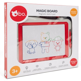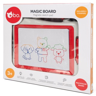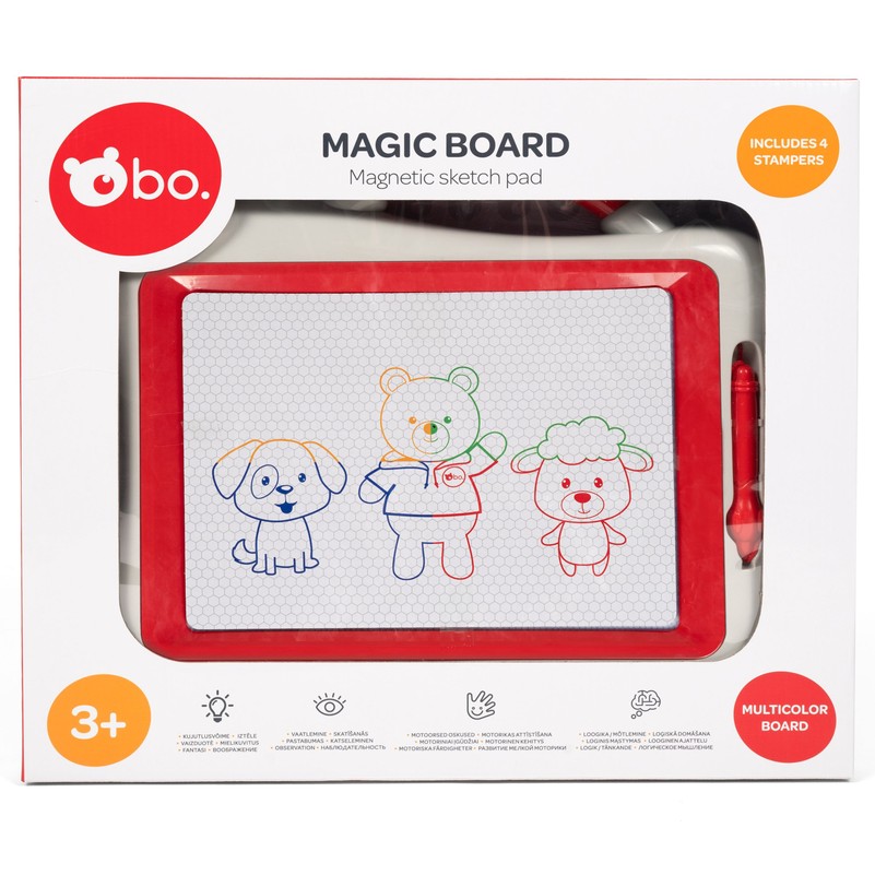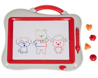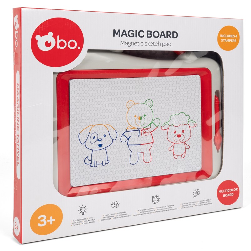 Magnetinė bo. piešimo lentelė supažindins vaiką su meno pasauliu! Tiesiog paimk magnetinį rašiklį ir pradėk piešti, o panorėjęs – viską greitai ištrink! Kad piešti būtų dar smagiau, pridedami ir keturi magnetiniai antspaudukai, o lentelės pagrindas yra keturių skirtingų spalvų. Dydis – 39 x 32 cm