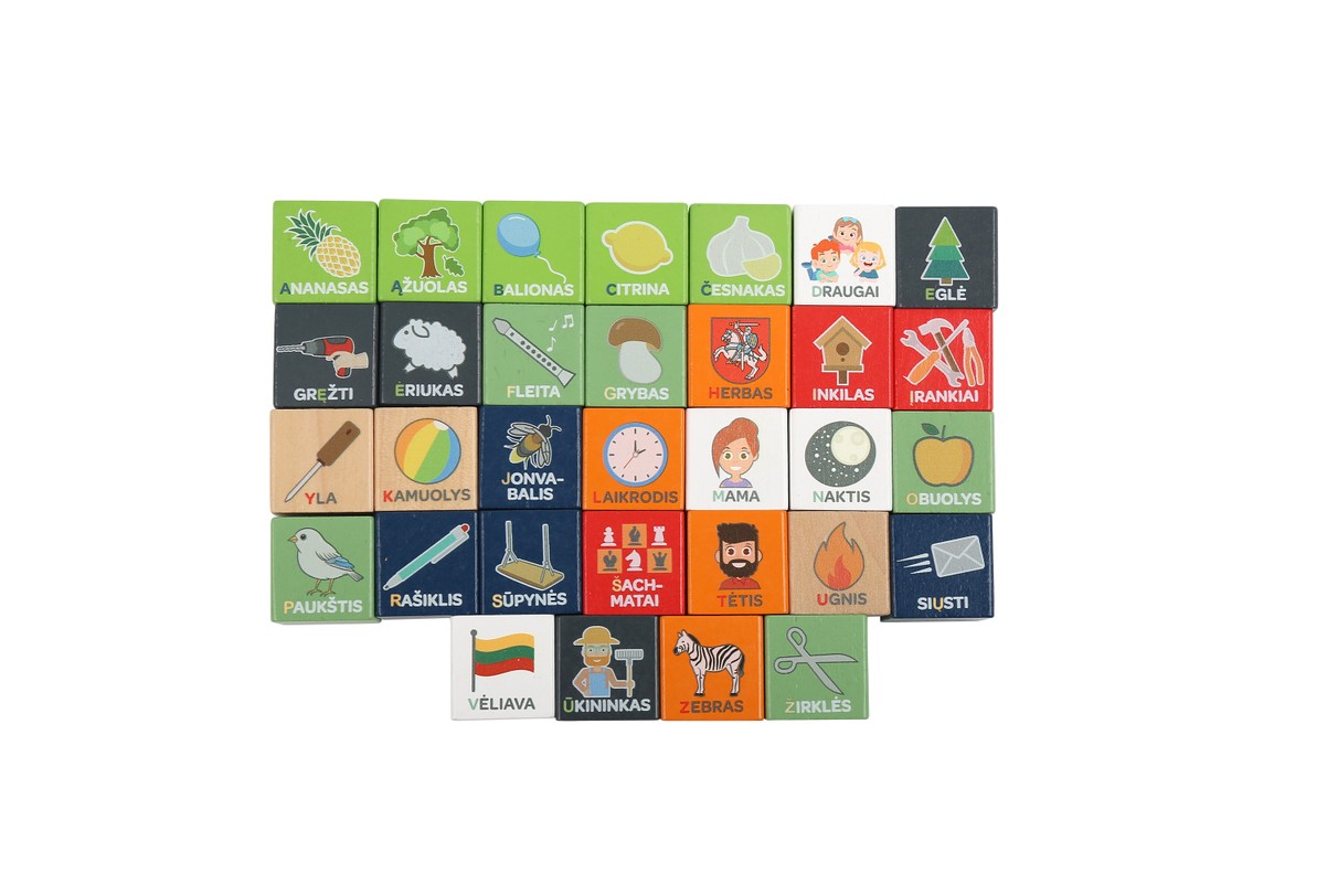 Mokomasis bo. medinių kaladėlių rinkinys „Abėcėlė ir žodžiai“ supažindina vaiką su raidžių ir žodžių pasauliu, moko lietuvių kalbos abėcėlės, ugdo gebėjimą susieti raides su paveikslėliais. bo. rinkinys – puikus pirmasis žingsnis mokantis skaityti. Rinkinyje esančios kaladėlės yra dvipusės – ant vienos jų pusės pavaizduotos raidės, ant kitos – žodžiai, todėl mokytis dar smagiau!