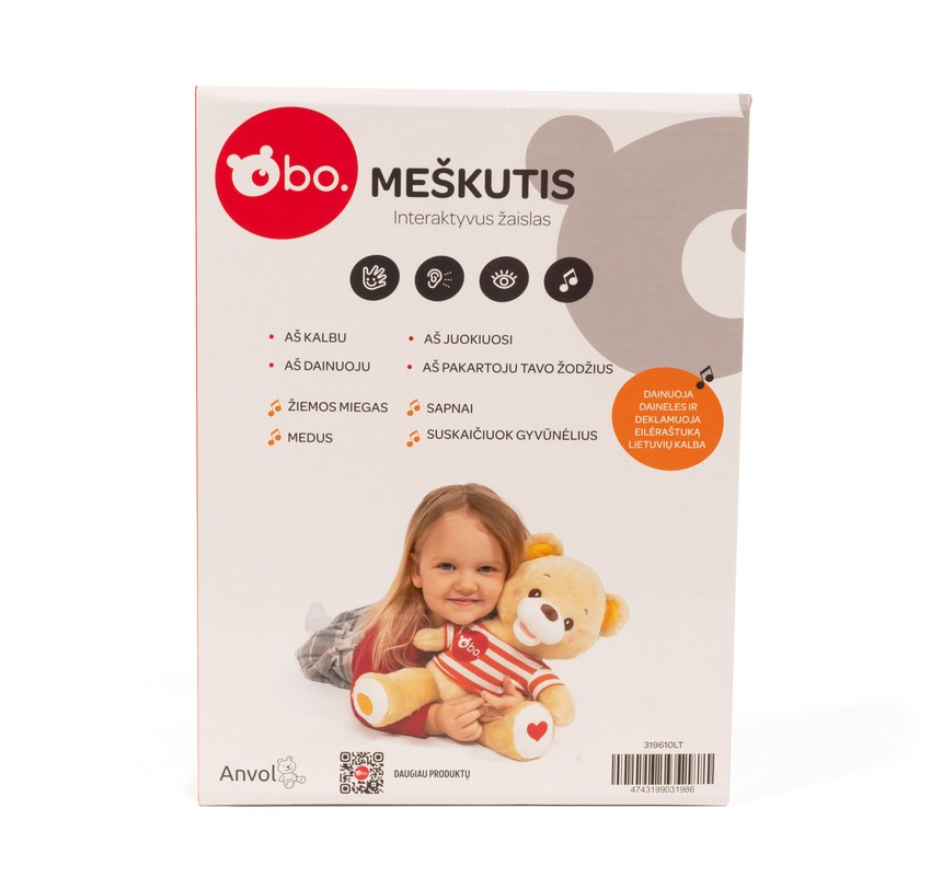bo. meškutis – tavo mielas ir žavus interaktyvus draugas! Šis unikalus meškutis dainuoja lietuviškas daineles, deklamuoja eilėraštuką ir atkartoja tavo balsą. Nori išgirsti, kaip jis juokiasi? Paspausk meškučio pilvuką! bo. meškutis vilki stilingus marškinėlius ir kviečia tave kūrybingiems ir vaizduotę lavinantiems žaidimams bei nesibaigiančioms linksmybėms ir tvirtai draugystei. Meškutis puikiai tiks ir pralinksmins bet kurio amžiaus vaikus. Pasiruošk patirti smagių akimirkų su bo. meškučiu, tavo mielu ir nepaprastu interaktyviu draugu. Parsinešk į namus magiją jau šiandien!