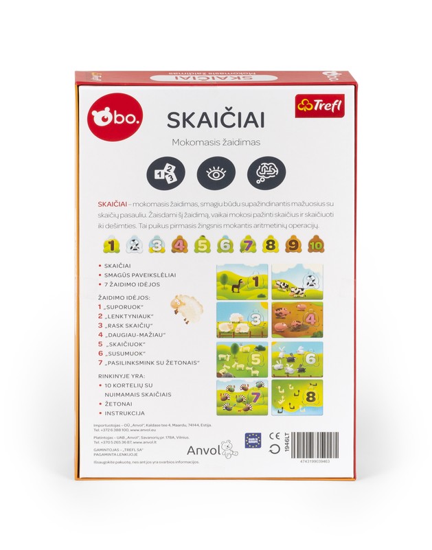 bo. „Skaičiai“ – mokomasis žaidimas, smagiu būdu supažindinantis mažuosius su skaičių pasauliu. Žaidimą sudaro nesudėtingos užduotėlės, kurias atlikdami vaikai mokosi skaičiuoti iki dešimties. Tai puikus pirmasis žingsnis mokantis aritmetinių operacijų. Aiškūs paveikslėliai padeda lengviau suskaičiuoti pavienes detales bei įvardinti jų skaičių kortelėse.