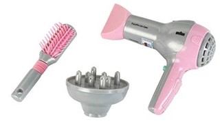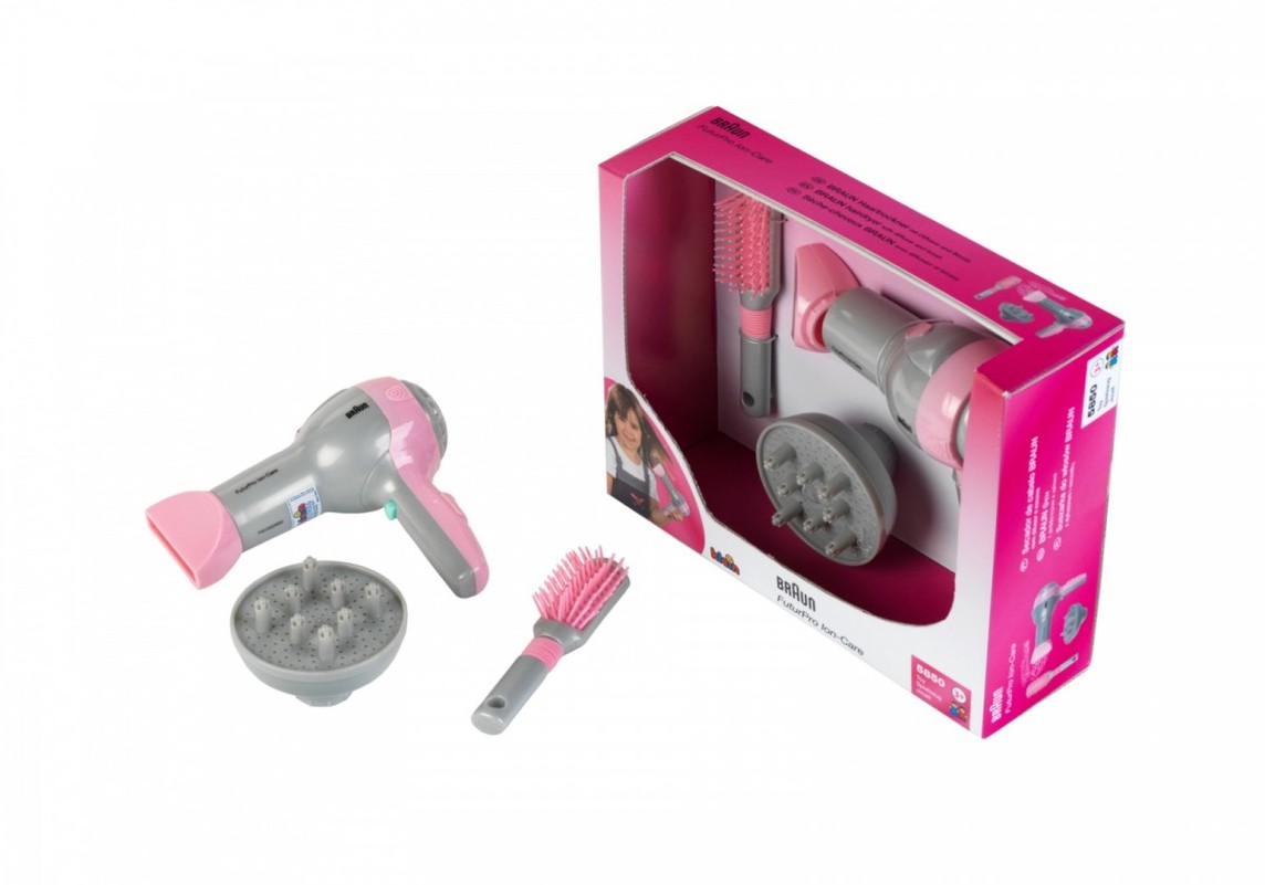 Su linksmu Braun plaukų džiovintuvu su difuzoriumi ir šepetėliu, plaukus formuokite ir stilizuokite kaip tikras kirpėjas! Plaukų džiovintuvas pučia orą, bet nešyla, todėl yra visiškai saugus vaikams. Žaislas sukurtas pagal Braun licenciją, jo dizainas remiasi tikru prietaisu. Žaislas ne tik yra saugus naudoti, bet ir suteikia vaikui galimybę jaustis taip, tarsi jis naudotų tikrą plaukų džiovintuvą. Vokiečių kompanija Klein specializuojasi kuriant licencijuotus žaislus. Maži plastikiniai žaislai atrodo kaip tikri, kasdieniai elektroniniai prietaisai. Klein plaukų džiovintuvų kolekcija pagal Braun licenciją daugiausia skirta mergaitėms. Ši serija siūlo platų tarpusavyje puikiai deračių produktų asortimentą. Žaisdami vaikai gali imituoti suaugusiųjų pasaulyje stebėtas situacijas. Žaislui reikalingos baterijos, kurios nėra įtrauktos į šį rinkinį.