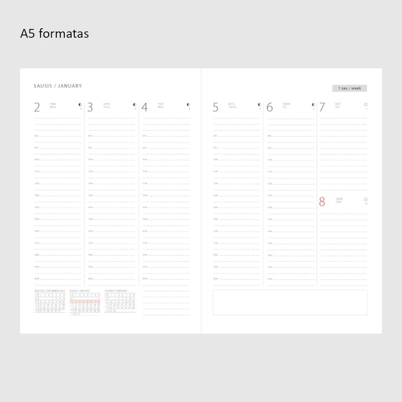 A5 formatas (145 x 210 mm), 144 psl., su pažymėtomis valandomis (darbo dienoms)