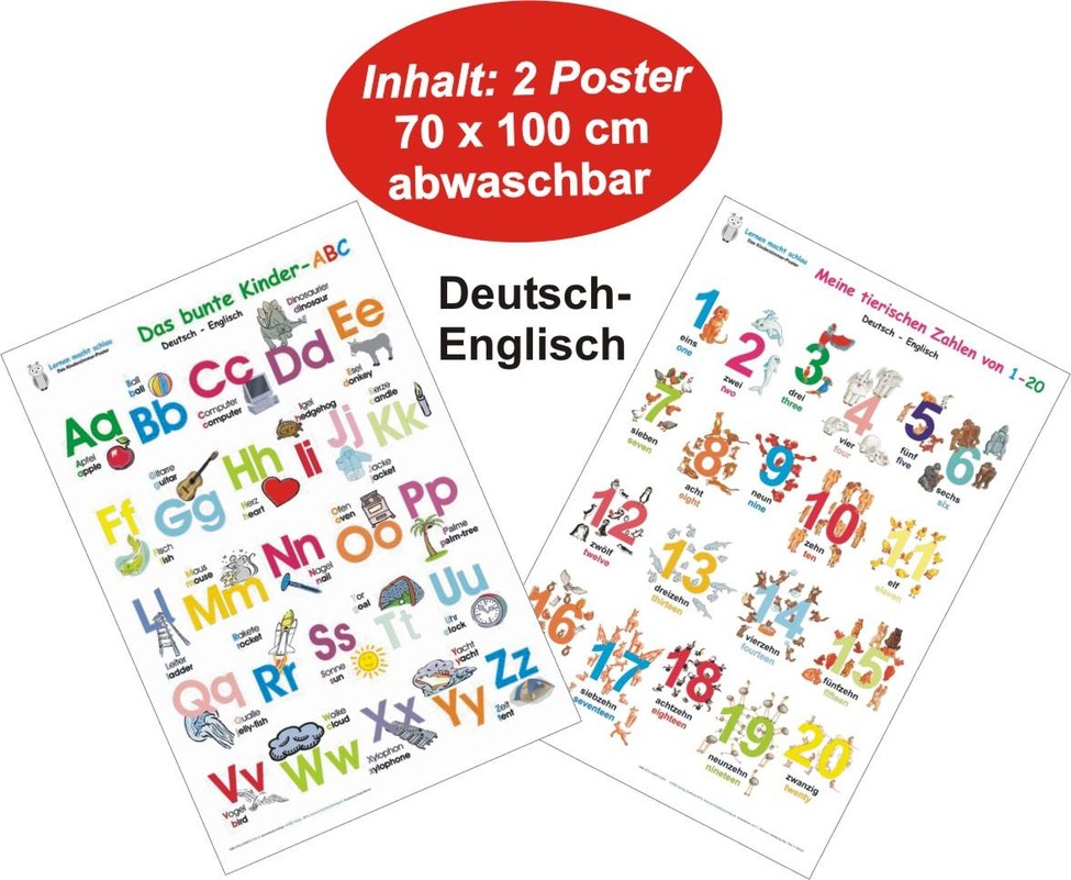 2 Lernen macht schlau-Lernposter: "Das bunte Kinder-ABC" und "Meine tierischen Zahlen von 1-20" Deutsch/Englisch! Kinder lernen bei dem ABC-Poster das Alphabet in Groß- und Kleinbuchstaben in deutscher und englischer Sprache kennen. Die abgebildeten Gegenstände und Tiere sind nach dem Alphabet geordnet und die Wörter sind ins englische übersetzt worden. Das Zahlenposter ist ein idealer Einstieg um die Kinder mit Zahlen und dem Abzählen vertraut zu machen. Die Anzahl der abgebildeten Tiere richtet sich nach der jeweiligen Zahl. In Deutsch und Englisch! So macht das erste Sprachen-Lernen Spaß! Die Poster sind gerollt und mit UV-Lack beschichtet. Abwaschbar!