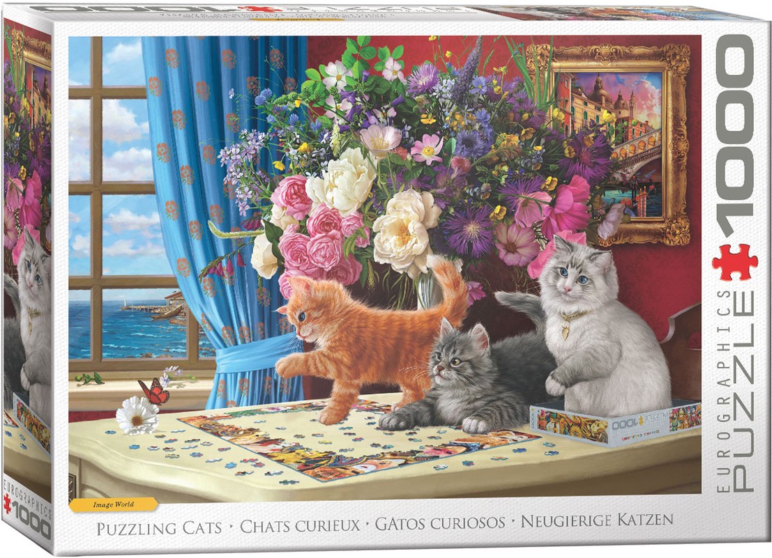 Ši žaisminga dėlionė sujungia smalsių kačiukų ir vaizdingo kambario, pilno ryškių gėlių bei ramaus pajūrio vaizdo derinį. Stebėkite, kaip išdykę kačiukai sąveikauja su dėlionės detalėmis, suteikdami jūsų galvosūkių sprendimo patirčiai žavingo kačių linksmybių akcento.