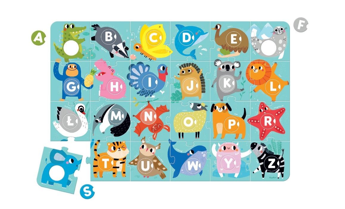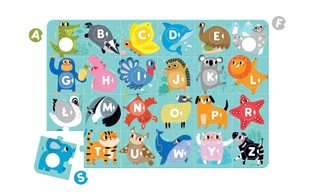 Didelio formato (96 x 64 cm) edukacinė dėlionė atvaizduoja 24 gyvūnus, atitinkančius abėcėlės raides. Komplekte yra 48 dideli gabalai, įskaitant 24 nuimamas apvalias dalis, ir gidą su idėjomis apie pažinimo žaidimus, pritaikytus vaikų gebėjimams. Dėlionės puikiai tinka namuose ir darželyje.