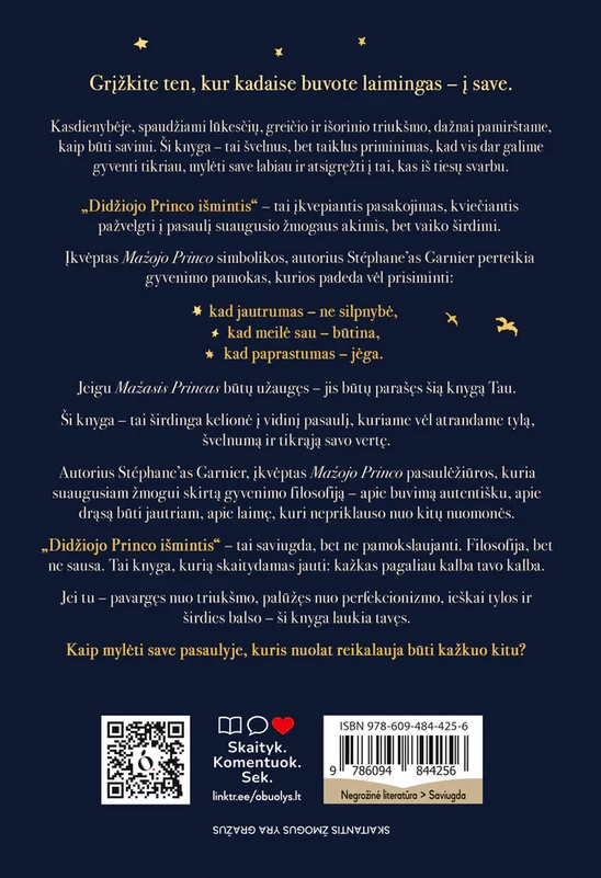 Kasdienybėje, spaudžiami lūkesčių, greičio ir išorinio triukšmo, dažnai pamirštame, kaip būti savimi. „Didžiojo Princo išmintis“ – tai švelnus, bet taiklus priminimas, kad vis dar galime gyventi tyliau, mylėti save labiau ir atsigręžti į tai, kas iš tiesų svarbu.