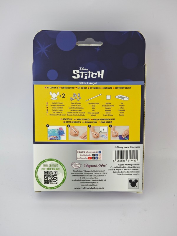 Leiskis į stebuklingą mėgstamiausių Disnėjaus istorijų pasaulį ir patirk daugybę nuotykių su mielais personažais! „Crystal Art“ – tai rankdarbių rinkiniai, puikiai tinkantys tiek vaikams, tiek suaugusiesiems. Su šiais rinkiniais ir „Crystal Art“ technika galėsi susikurti išskirtinių, blizgančiais kristalais žėrinčių figūrėlių! Su „Crystal Art“ kurti paprasta – tiesiog nulupk apsauginį figūrėlės sluoksnį ir pradėk klijuoti blizgučius. Blizgančias Stičo ir Angel figūrėles gali naudoti kaip aksesuarą, pastatyti jas ant akrilinio stovelio ar netgi panaudoti kaip magnetukus ir papuošti jomis šaldytuvą ar kompiuterį! Figūrėlių dydis – 5 cm.