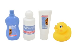 Rinkinyje yra vonelė, 3 buteliukai prausimosi priemonių ir ančiukas. Rinkinys tinka lėlėms iki 41 cm.