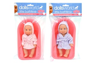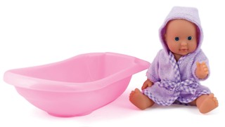 Rinkinyje yra 17 cm lėlytė, kurią galima maudyti, vonelė ir chalatas. Asortimente – 2 skirtingos spalvos.