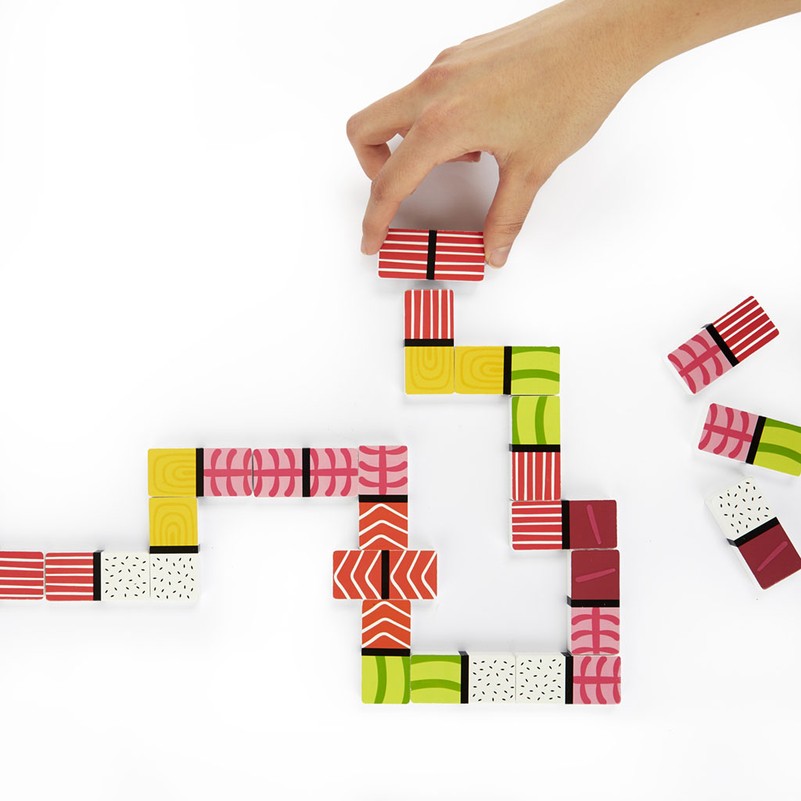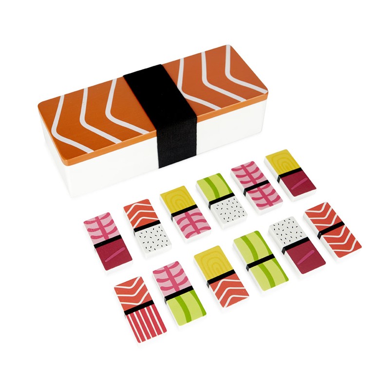 ORIGINALUS. Spalvingas domino! Rinkinyje yra 28 detalės ir medinė dėžutė, visos su nigiri dizainu.