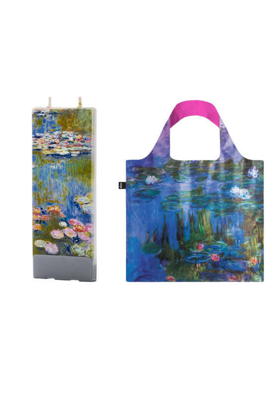 Dovanų rinkinys Žvakė FLATYZ „Claude Monet – Water Lilies“, 15 cm + LOQI pirkinių krepšys „CLAUDE MONET Water Lilies Neon Recycled Bag“