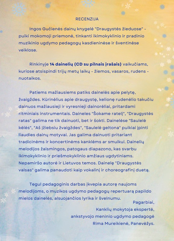 Vaikiškų dainelių knyga „Draugystės žieduose“ – puiki mokomoji priemonė, tinkanti ikimokyklinio ir pradinio muzikinio ugdymo pedagogų kasdieninėse ir šventinėse veiklose. Rinkinyje 14 dainelių (CD su pilnais įrašais) vaikučiams, kuriose atsispindi trijų metų laikų – žiemos, vasaros, rudens – nuotaikos.