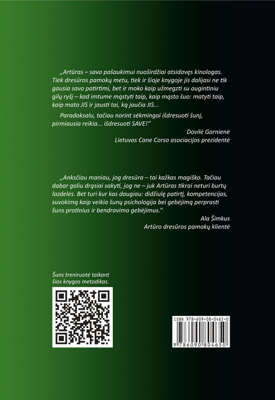 „Artūras – savo pašaukimui nuoširdžiai atsidavęs kinologas. Tiek dresūros pamokų metu, tiek ir šioje knygoje jis dalijasi ne tik gausia savo patirtimi, bet ir moko kaip užmegzti su augintiniu gilų ryšį – kad imtume mąstyti taip, kaip mąsto šuo: matyti taip, kaip mato JIS ir jausti tai, ką jaučia JIS... Paradoksalu, tačiau norint sėkmingai išdresuoti šunį, pirmiausia reikia... išdresuoti SAVE!“ – Dovilė Garnienė, Lietuvos Cane Corso asociacijos prezidentė