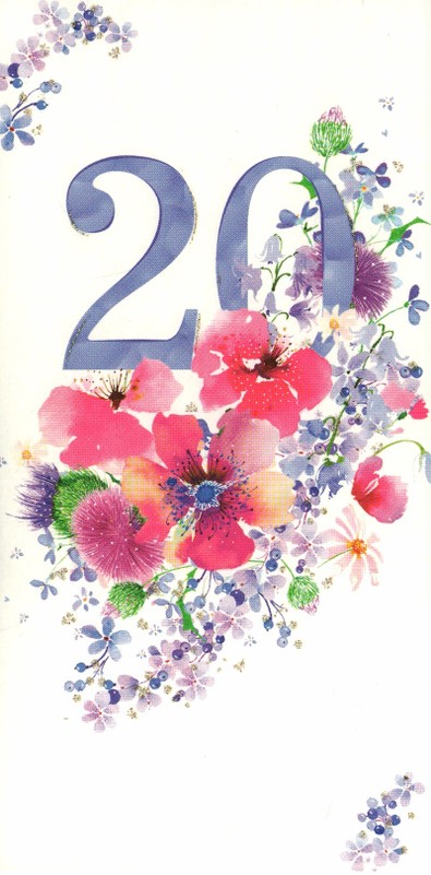 Originalus dvigubas atvirukas papuoštas piešiniu ir auksiniais ornamentais. Skirtas dovanoti 20-tojo gimtadienio proga.