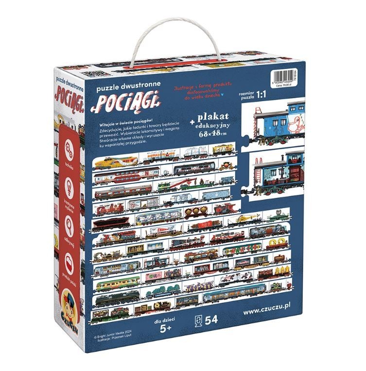 Dvigubos pusės traukiniai dėlionės yra rinkinys, kuris skatins ne tik ikimokyklinukus žaisti! Novatoriškas požiūris leidžia sujungti elementus bet kokiu norimu būdu, tai iš tiesų kūrybingas dėlionių rinkinys. Be to, dėlionės yra dvipusės, o detali iliustracija leidžia pažinti lokomotyvus ir vagonus iš išorės ir vidaus.