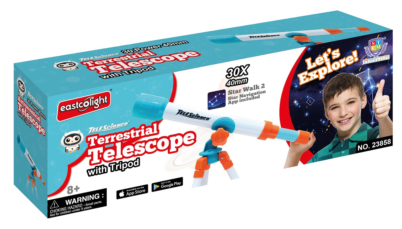 Antžeminis 30x teleskopas su 40 mm skersmens objektyvu, su trikoju.
