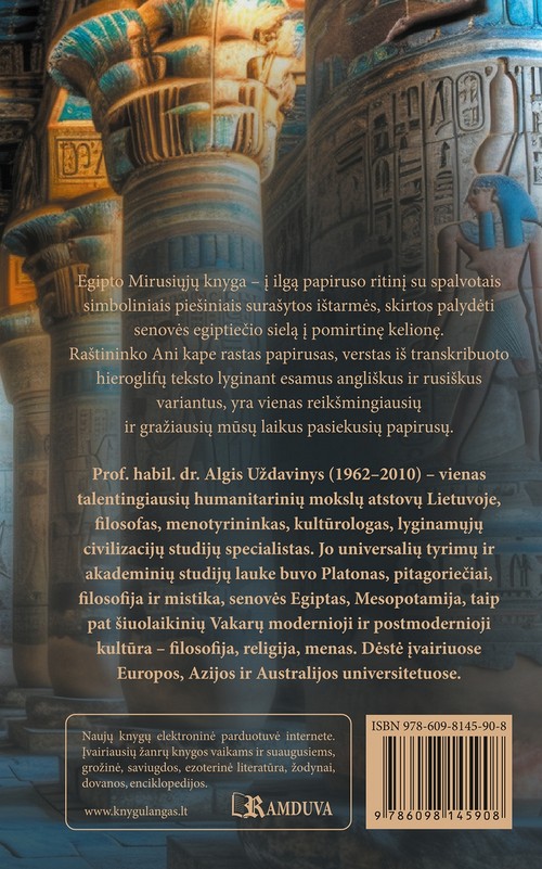 Skaitytojui pateikiamas pilnas raštininko Ani kape rasto papiruso (apie 1420 m. pr. Kr.) vertimas iš transkribuoto hieroglifų teksto, atliktas lyginant esamus angliškus bei rusiškus variantus. Tekstą lydi vinječių aprašymai ir išsami mokslinė studija apie senovės Egipto dvasinę kultūrą.