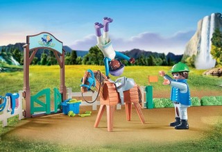 Puikus pramogos su arkliais: modernaus PLAYMOBIL jojimo arena, pagaminta iš patvarių medžiagų, turi judamą užtvarą, dvi PLAYMOBIL figūras, arkliuką ir daugybę puikių jojimo aksesuarų.