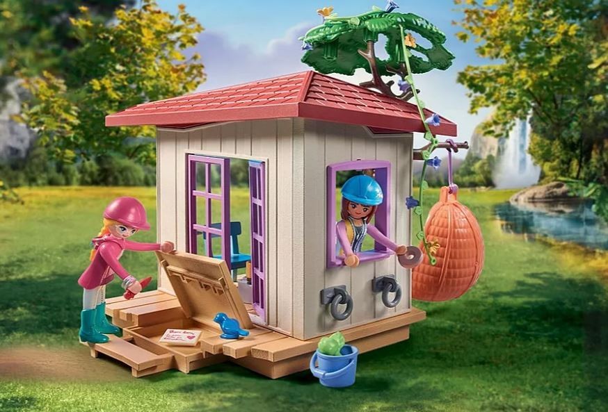 Leiskitės į žirgų nuotykį su paslaptingu PLAYMOBIL Žirgų mylėtojų klubu! Už mažo krioklio, giliai miške, Krioklių žirgų grupė pastatė sau žavingą klubą su jaukiu supamojo krėslo ir praktiška paslaptinga slėptuve! Puiki vieta atsipalaiduoti po ilgos kelionės arba slaptam klubo susitikimui. Izabella ir Amelija visada turi kartu puodelį karštos kakavos ir skanių bagelių. Draugiškas arklys klausosi grupės juoko ir paukščių čirškimo.