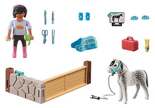 Nuoširdžiai sukurtas rinkinys su PLAYMOBIL figūrėle, poniu, arklio paklode, bintais, kantryne ir daugybe kitų arklių priežiūros priedų.