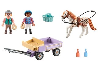 Didelis malonumas arklių mėgėjams: PLAYMOBIL Pony vežimas su dviem figūromis ir poniu bei daugybe priedų. Du ponių mylėtojai leidžiasi į vežimo išvyką. Yra vietos pikniko krepšiui ir apsipirkimui.