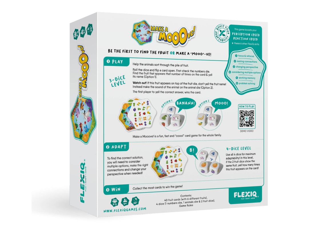 Norėdami laimėti, stenkitės pirmasis surasti vaisių arba pavaizduoti gyvūno skleidžiamą garsą ir surinkti daugiausia kortelių! Žaisdami „FlexiQ“ žaidimus vaikai ir suaugusieji ugdo ir stiprina savo... PAŽINTINĮ LANKSTUMĄ. Tai gebėjimas, leidžiantis spontaniškai pertvarkyti savo žinias, prisitaikyti ir efektyviai reaguoti į besikeičiančią situaciją. Lavindami savo pažintinio lankstumo įgūdžius, vaikai galės išnaudoti visą savo potencialą nuolat besikeičiančiame pasaulyje! „FlexiQ“ žaidimai padės tam pasiruošti!