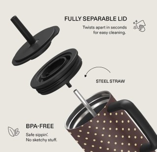 • Medžiagos: 304L nerūdijantis plienas (korpusas ir šiaudelis), PP + silikonas be BPA (dangtelis), PP (rankena).