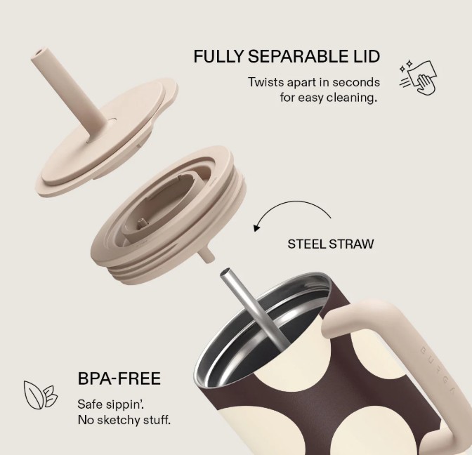 Ši 1,2L talpos BURGA gertuvė išlaiko jūsų gėrimą karštą 12 valandų, šaltą visą dieną ir yra visiškai nepralaidi dėl sandaraus dangtelio su šiaudeliu, kuris užsirakina. Ji tinka jūsų automobilio puodelių laikikliui, turi patogią rankeną ir yra įvairių spalvų, kurias galite derinti prie savo aprangos.