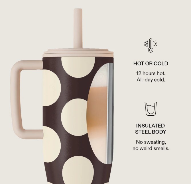• Dvigubos sienelės izoliacija: gėrimai išlieka karšti iki 12 valandų, o šalti – dar ilgiau.