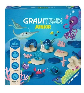 GraviTrax Junior yra interaktyvi kamuoliuko trasos sistema, sukurta atsižvelgiant į pačius mažiausius. Atraskite gravitacijos galią, kurdami savo teminius pasaulius, plėsdami juos ir dekoruodami patys!Vandens plėtros rinkinys yra papildymas bet kuriam GraviTrax Junior pradžios rinkiniui. Pasinerti į povandeninį pasaulį! Čia sutiksite nuostabių gyvūnų - roply, krabą ir net medūzą. Įveikite kitus trasos posūkius su plastikiniu kamuoliu. Tik saugokitės žandikaulių!Sukurkite visiškai naują trasą na…