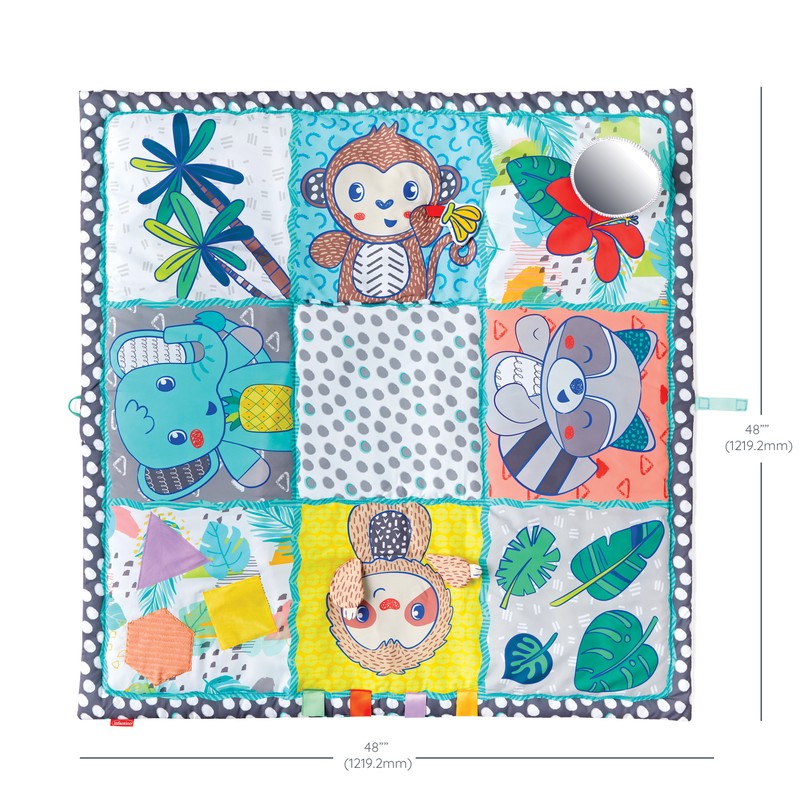 „Infantino“ – išmanaus dizaino produktai laimingai vaikystei ir smagiai tėvystei! Didžiulis jutimus lavinantis atradimų kilimėlis – tai didelė ir smagi erdvė mažiesiems smalsučiams. Nuo įsivaizduojamo beždžionėlės maitinimo iki tekstūrinių formų, garsų, spalvingų juostelių ir didžiulio veidrodžio atradimo – mažylis džiaugsis ir bus ilgam užsiėmęs smagia ir įtraukiančia veikla. Kilimėlis patogiai susilanksto, todėl jį lengva pernešti iš vienos vietos į kitą ar vežtis į kelionę. Didžiulis, net 120 x 120 cm kilimėlis suteikia pakankamai vietos ridinėtis, šliaužioti, sėdėti, gulėti ir užsiimti linksma veikla. Ant kilimėlio esančios veiklos paskatins mažylio smalsumą ir lavins smulkiąją bei stambiąją motoriką. Kilimėlį galima skalbti skalbyklėje.