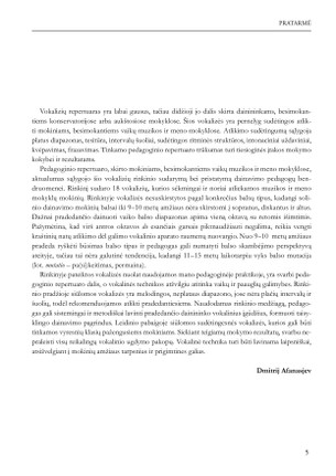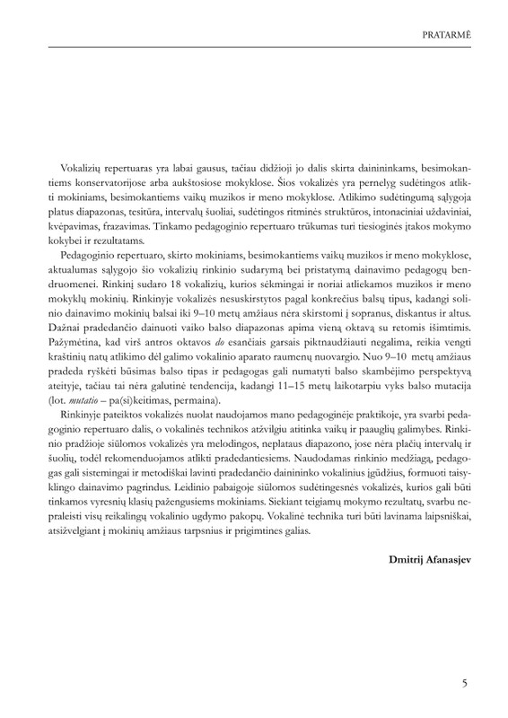 Leidinyje pateikiama solinio dainavimo mokytojo metodininko Dmitrij Afanasjev pedagoginio repertuaro dalis – vokalizės, tinkamos vaikams ir paaugliams, besimokantiems muzikos bei meno mokyklose. Ilgamečio pedagoginio darbo rezultatai užtikrina leidinyje esamų vokalizių tinkamumą, svarbą ir naudą mokinių vokaliniam ugdymui. Muzikos ir meno mokyklų mokiniai sėkmingai ir noriai atlieka siūlomas vokalizes.