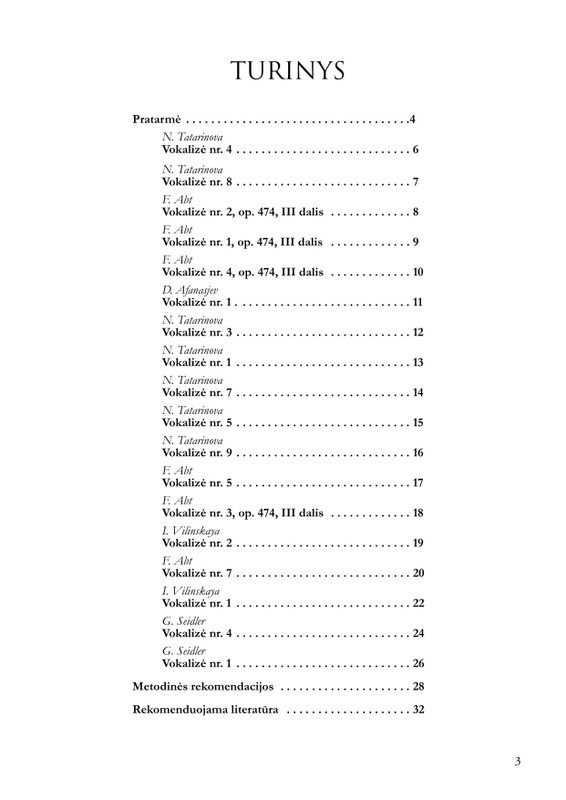 Metodinę priemonę sudaro 18 vokalizių, sukauptų per dvidešimt pedagoginio darbo metų. Leidinyje pateikiamos metodinės rekomendacijos, kuriose nagrinėjamos galimos vokalinės technikos problemos ir jų sprendimo būdai. Pabaigoje pateiktas išsamus ir vertingas rekomenduojamos literatūros sąrašas.